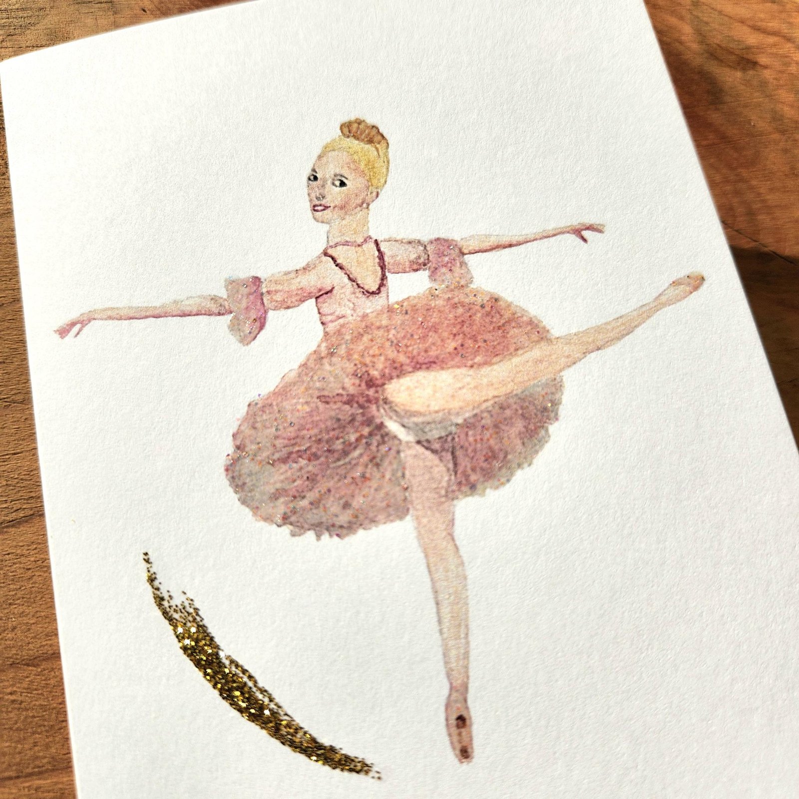 A soft watercolor illustration of the Sugar Plum Fairy in mid-dance, her tutu shimmering with hand-applied glitter. Graceful, festive, and full of Nutcracker magic, this card is perfect for dancers, ballet lovers, and anyone who adores a little seasonal enchantment.